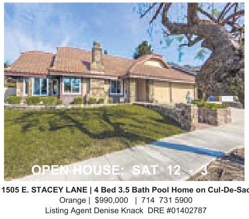 1505 E.STACEY LANE |4Bed 3.5 Bath Pool Home onCul-De-Sac Orange | $990,000 | 714 731 5900 Listing Agent Denise Knack DRE #01402787