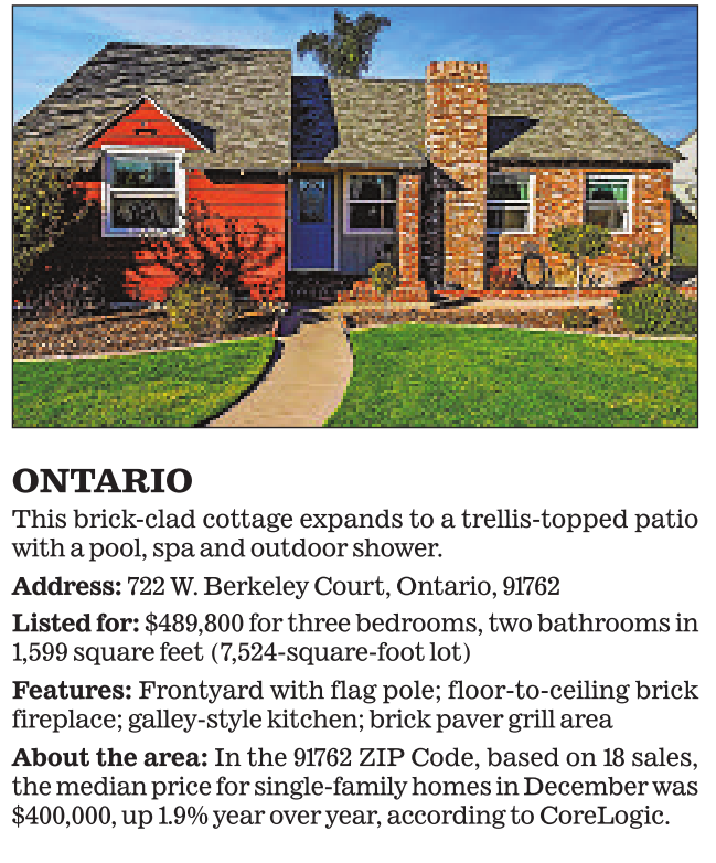 ONTARIO This brick-clad cottage expands to a trellis-topped patio with a pool, spa and outdoor shower. Address: 722 W. Berkeley Court, Ontario, 91762 Listed for: $489,800 for three bedrooms, two bathrooms in 1,599 square feet (7,524-square-foot lot) Features: Frontyard with flag pole; floor-to-ceiling brick fireplace; galley-style kitchen; brick paver grill area About the area: In the 91762 ZIP Code, based on 18 sales, the median price for single-family homes in December was $400,000, up 1.9% year over year, according to CoreLogic. See also