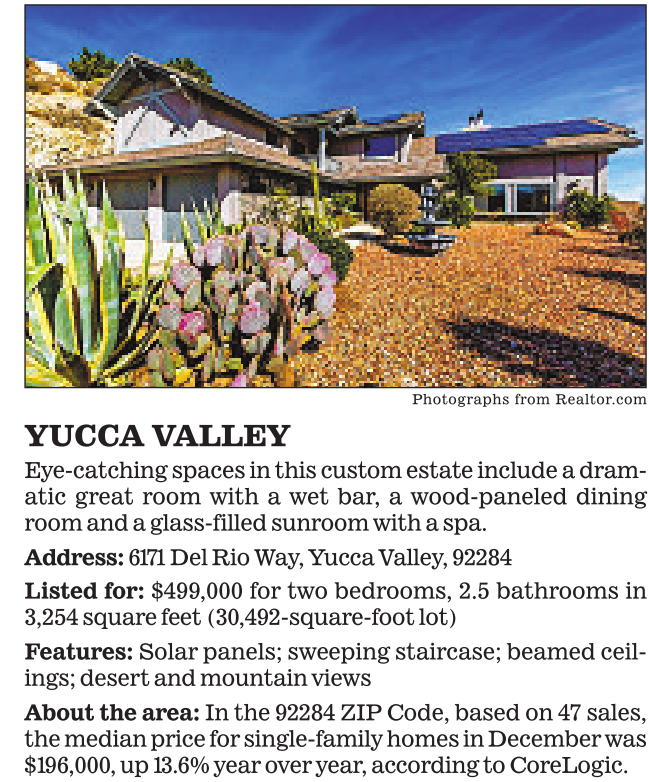 YUCCA VALLEY Eye-catching spaces in this custom estate include a dramatic great room with a wet bar, a wood-paneled dining room and a glass-filled sunroom with a spa. Address: 6171 Del Rio Way, Yucca Valley, 92284 Photographs from Realtor.com Listed for: $499,000 for two bedrooms, 2.5 bathrooms in 3,254 square feet (30,492-square-foot lot) Features: Solar panels; sweeping staircase; beamed ceilings; desert and mountain views About the area: In the 92284 ZIP Code, based on 47 sales, the median price for single-family homes in December was $196,000, up 13.6% year over year, according to CoreLogic. See also