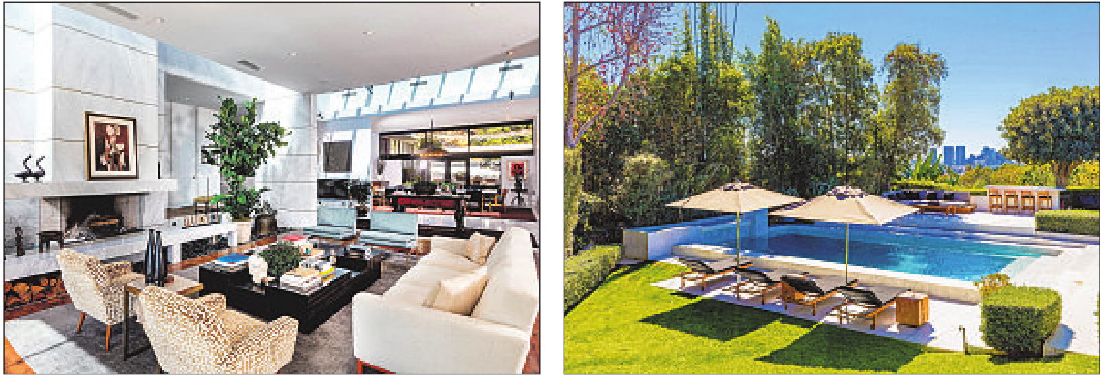 Features: Walls of glass; living room with floating fireplace; wet bar; formal dining room; music room; library; commercial kitchen and butler’s pantry; master suite with two bathrooms; pool