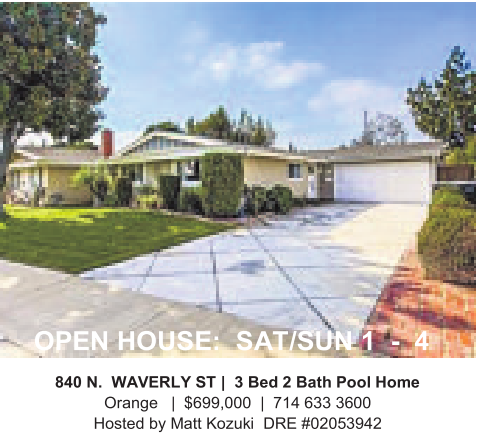 840 N. WAVERLY ST | 3 Bed 2Bath Pool Home Orange | $699,000 | 714 633 3600 Hosted byMatt Kozuki DRE #02053942