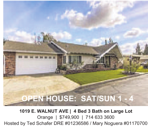 1019 E.WALNUT AVE | 4 Bed 3Bath onLarge Lot Orange | $749,900 | 714 633 3600 Hosted by Ted Schafer DRE #01236586 /Mary Noguera #01170700