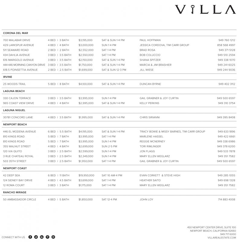700 MALABAR DRIVE 4 BED | 3 BATH $3,195,000 SAT & SUN 1-4 PM PAUL HOFFMAN 949 760 1212 429 LARKSPUR AVENUE 4 BED | 4 BATH $3,000,000 SUN 1-4 PM JESSICA CORDOVA, TIM CARR GROUP 858 568 4997 511 SEAWARD ROAD 2 BED | 2 BATH $2,552,000 SAT 1-4 PM BRAD ROSA 949 371 5128 434 DAHLIA AVENUE 3 BED | 3.5 BATH $2,550,000 SAT 1-4 PM BOB COLUCCIO 949 510 2594 616 MARIGOLD AVENUE 3 BED | 3.5 BATH $2,150,000 SAT & SUN 1-4 PM SHANA SPITZER 949 338 1070 444-446 MORNING CANYON DRIVE 3 BED | 3.5 BATH $1,750,000 SAT & SUN 1-4 PM MARCIA & JIM BRASHIER 949 241 6025 618.5 POINSETTIA AVENUE 2 BED | 2.5 BATH $1,699,000 SAT & SUN 12-3 PM JILL WIESE 949 244 9036