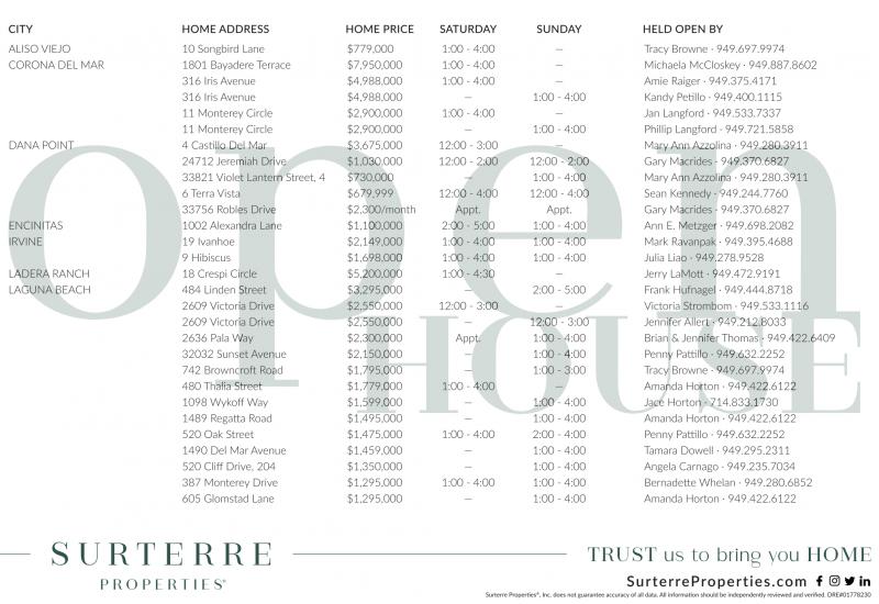 CITY HOME ADDRESS HOME PRICE SATURDAY SUNDAY HELD OPEN BY ALISO VIEJO 10 Songbird Lane $779,000 1:00 - 4:00 — Tracy Browne · 949.697.9974 CORONA DEL MAR 1801 Bayadere Terrace $7,950,000 1:00 - 4:00 — Michaela McCloskey · 949.887.8602 316 Iris Avenue $4,988,000 1:00 - 4:00 — Amie Raiger · 949.375.4171 11 Monterey Circle $2,900,000 1:00 - 4:00 — Jan Langford · 949.533.7337 11 Monterey Circle $2,900,000 — 1:00 - 4:00 Phillip Langford · 949.721.5858 DANA POINT 24712 Jeremiah Drive $1,030,000 12:00 - 2:00 12:00 - 2:00 Gary Macrides · 949.370.6827 33821 Violet Lantern Street, 4 $730,000 — 1:00 - 4:00 Mary Ann Azzolina · 949.280.3911 6 Terra Vista $679,999 12:00 - 4:00 12:00 - 4:00 Sean Kennedy · 949.244.7760 33756 Robles Drive $2,300/month Appt. Appt. Gary Macrides · 949.370.6827 ENCINITAS 1002 Alexandra Lane $1,100,000 2:00 - 5:00 1:00 - 4:00 Ann E. Metzger · 949.698.2082 IRVINE 19 Ivanhoe $2,149,000 1:00 - 4:00 1:00 - 4:00 Mark Ravanpak · 949.395.4688 9 Hibiscus $1,698,000 1:00 - 4:00 1:00 - 4:00 Julia Liao · 949.278.9528 LADERA RANCH LAGUNA BEACH 484 Linden Street $3,295,000 — 2:00 - 5:00 Frank Hufnagel · 949.444.8718 2609 Victoria Drive $2,550,000 12:00 - 3:00 — Victoria Strombom · 949.533.1116 2609 Victoria Drive $2,550,000 — 12:00 - 3:00 Jennifer Allert · 949.212.8033 2636 Pala Way $2,300,000 Appt. 1:00 - 4:00 Brian & Jennifer Thomas · 949.422.6409 480 Thalia Street $1,779,000 1:00 - 4:00 — Amanda Horton · 949.422.6122 1490 Del Mar Avenue $1,459,000 — 1:00 - 4:00 Tamara Dowell · 949.295.2311 605 Glomstad Lane $1,295,000 — 1:00 - 4:00 Amanda Horton · 949.422.6122