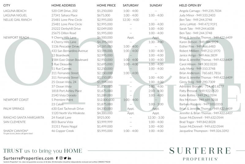 CITY HOME ADDRESS HOME PRICE SATURDAY SUNDAY HELD OPEN BY LAGUNA BEACH LAGUNA NIGUEL 27341 Sahara Place $675,000 1:00 - 4:00 1:00 - 4:00 Judy Minor · 949.533.2403 NELLIE GAIL RANCH 25481 Lone Pine Circle $2,995,000 12:30 - 4:00 — Ben Tate · 949.244.3748 25222 Derbyhill Drive $2,049,000 — 1:00 - 4:00 Sarah Tate · 949.244.6038 25675 Dillon Road $1,995,000 — 1:00 - 4:00 Ben Tate · 949.244.3748 NEWPORT BEACH 9 Cherry Hills Lane $6,500,000 Appt. Appt. Brian & Jennifer Thomas · 949.422.6409 4 Cherry Hills Lane $4,395,000 — 1:30 - 4:00 Karen Betson · 949.584.5929 1136 Pescador Drive $4,185,000 1:00 - 4:00 — Esther Fine · 949.466.6483 433 San Bernardino Avenue $3,598,000 1:00 - 4:00 1:00 - 4:00 Robert Milliken · 949.212.1970 12 Boardwalk $2,995,000 — 1:00 - 4:00 Janice Arrigo · 949.466.3839 1584 East Ocean Boulevard $2,950,000 1:00 - 4:00 1:00 - 4:00 Brian & Jennifer Thomas · 949.422.6409 5 Rue Deauville $2,695,000 1:00 - 4:00 1:00 - 4:00 Carol Allison · 949.302.0220 11 Rue Cannes $2,250,000 — 1:00 - 4:00 Judy Mertz · 949.510.3748 311 Fernando Street $2,150,000 1:00 - 4:00 — Brian Anderson · 760.681.7816 311 Fernando Street $2,150,000 — 1:00 - 4:00 Brian & Jennifer Thomas · 949.422.6409 25 Ocean Vista, 24 $1,995,000 — 1:00 - 4:00 Ginny Berg · 949.290.7309 37 Ocean Vista $1,850,000 — 1:00 - 4:00 Adrienne Brandes · 714.401.8277 NEWPORT COAST 5 Premiere Point $12,000,000 1:00 - 4:00 — Rex McKown · 949.689.5018 23 Calais $1,875,000 — 1:00 - 3:00 Barbara Roppolo · 949.500.0310 PALM SPRINGS 630 East Tachevah Drive $4,300,000 Appt. Appt. Brian & Jennifer Thomas · 949.422.6409 1120 North Via Miraleste $4,300,000 Appt. Appt. Jennifer & Brian Thomas · 949.422.6407 RANCHO SANTA MARGARITA 24 Foxtail Lane $925,000 — 12:30 - 3:30 Susan McDonnell · 949.632.0544 SAN CLEMENTE 803 Buena Vista $3,999,999 — 1:00 - 4:00 Brad Trager · 949.842.8028 31311 Paseo Nogal $1,499,000 — 1:00 - 4:00 Susan McDonnell · 949.632.0544 SHADY CANYON ® 46 Copper Creek $5,995,000 1:00 - 4:00 1:00 - 4:00 Jacqueline Thompson · 949.326.3392