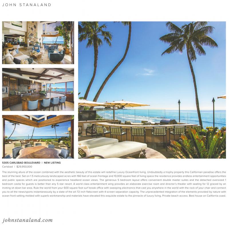 J O H N S T A N A L A N D 5305 CARLSBAD BOULEVARD | NEW LISTING Carlsbad | $29,950,000 The stunning allure of the ocean combined with the aesthetic beauty of this estate will redefine Luxury Oceanfront living. Undoubtedly a trophy property this Californian paradise offers the best of the best. Set on 1.5 meticulously landscaped acres with 166 feet of ocean frontage and 10,000 square feet of living space the residence provides endless entertainment opportunities and public spaces which are positioned to experience headland ocean views. The generous 5 bedroom layout offers convenient double master suites and the detached oversized 1 bedroom casita for guests is better than any 5 star resort. A world class entertainment wing provides an elaborate exercise room and director’s theater with seating for 12 graced by an inviting sit down bar area. Rule the world from your 600 square foot surf break office with sweeping electronics that cast you anywhere in the world with the rock of your chair and connect you to all the news/sports instantaneously by a state of the art 72 inch flatscreen with 4 screen separation capacity. The unprecedented integration of the elements provided by nature with ocean front setting melded with superb workmanship and materials have elevated this exquisite estate to the pinnacle of luxury living. Private beach access. Best house on California coast. johnstanaland .com