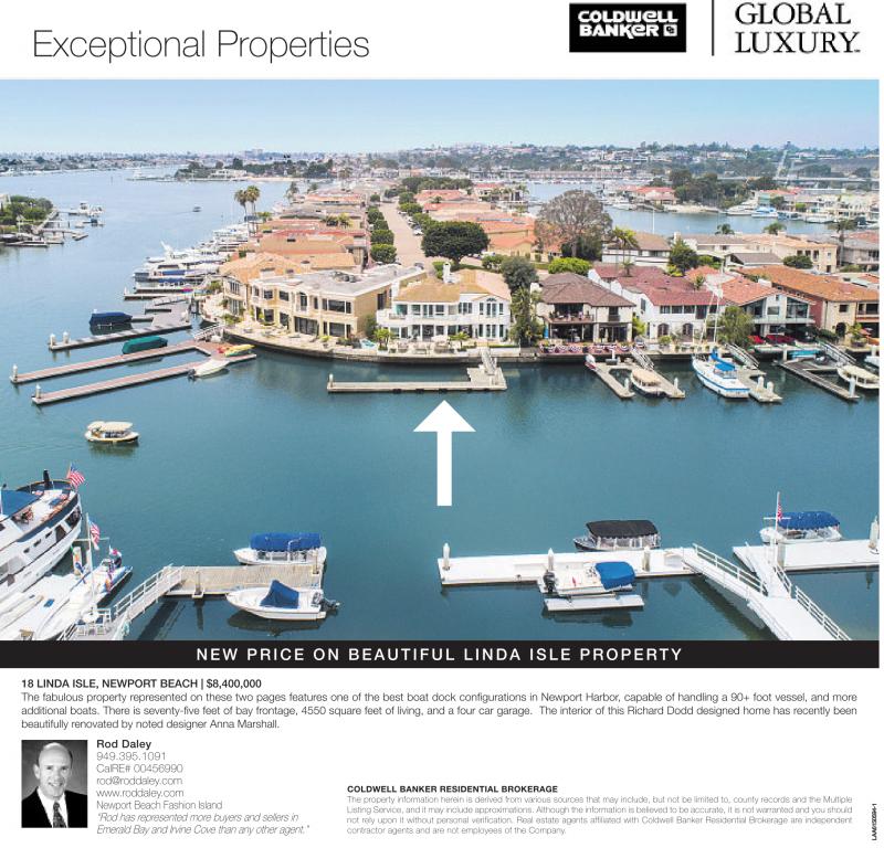 18 LINDA ISLE, NEWPORT BEACH | $8,400,000 The fabulous property represented on these two pages features one of the best boat dock configurations in Newport Harbor, capable of handling a 90+ foot vessel, and more additional boats. There is seventy-five feet of bay frontage, 4550 square feet of living, and a four car garage. The interior of this Richard Dodd designed home has recently been beautifully renovated by noted designer Anna Marshall.