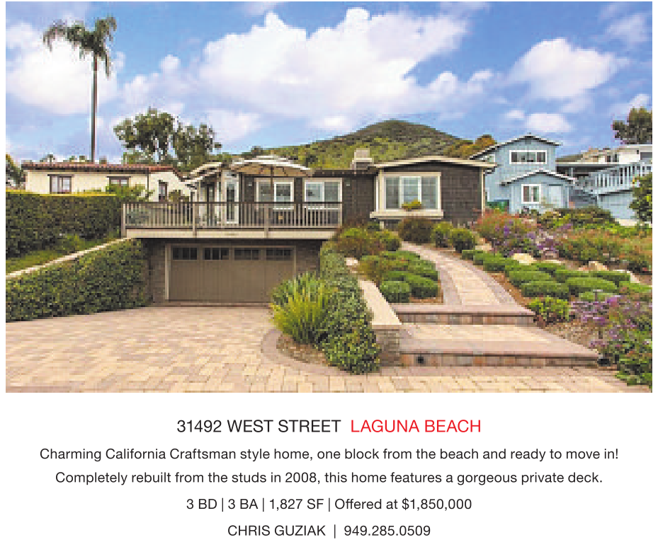 31492 WEST STREET LAGUNA BEACH Charming California Craftsman style home, one block from the beach and ready tomove in! Completely rebuilt from the studs in 2008, this home features agorgeous private deck. 3BD|3BA |1,827 SF|Offered at $1,850,000 CHRIS GUZIAK | 949.285.0509