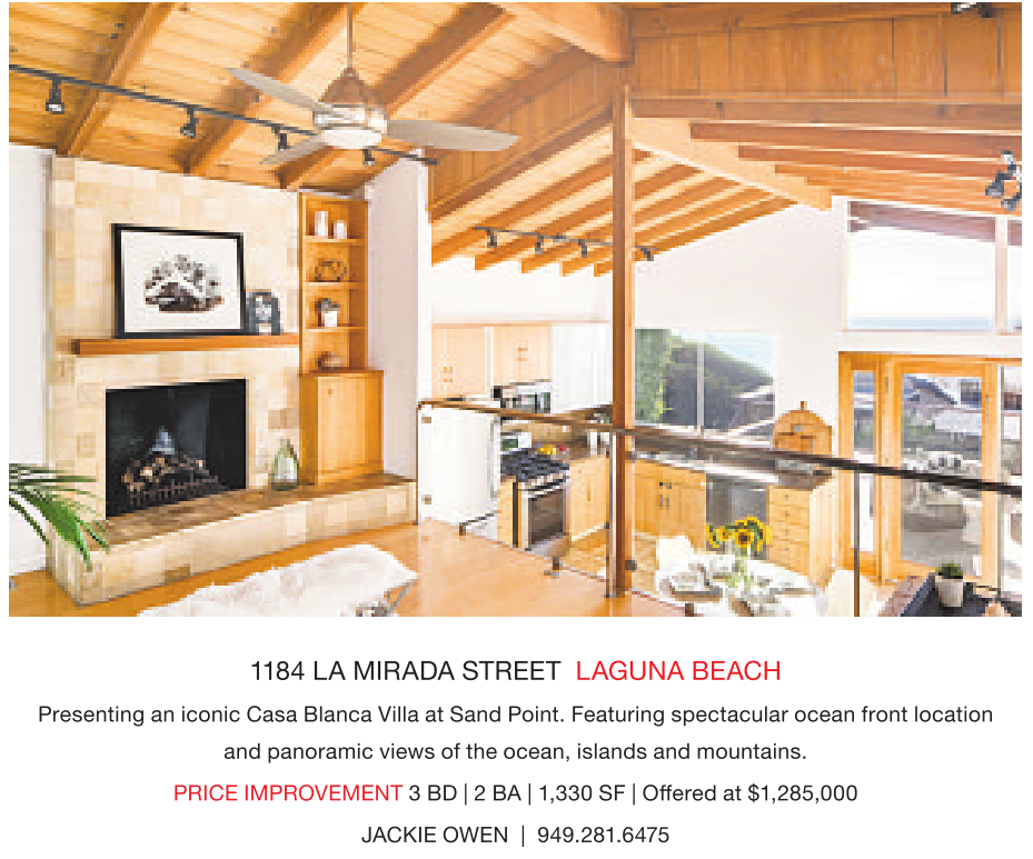 1184 LA MIRADA STREET LAGUNA BEACH Presenting an iconic Casa Blanca Villa atSand Point. Featuring spectacular ocean front location and panoramic views ofthe ocean, islands and mountains. PRICE IMPROVEMENT 3BD|2BA |1,330 SF |Offered at $1,285,000 JACKIE OWEN | 949.281.6475