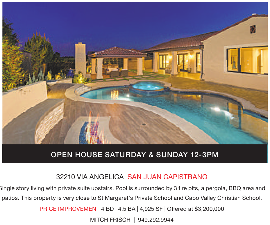 OPEN HOUSE SATURDAY & SUNDAY 12-3PM 32210 VIA ANGELICA SAN JUAN CAPISTRANO Single story living with private suite upstairs. Pool is surrounded by3fire pits, apergola, BBQ area and patios. This property is very close to St Margaret's Private School and Capo Valley Christian School. PRICE IMPROVEMENT 4BD|4.5 BA |4,925 SF |Offered at $3,200,000 MITCH FRISCH | 949.292.9944
