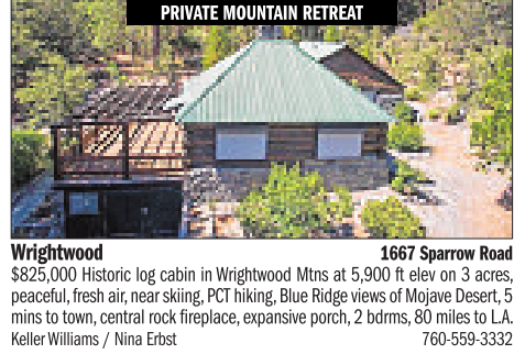 Wrightwood 1667 Sparrow Road $825,000 Historic logcabin in Wrightwood Mtns at 5,900 ft elevon3acres, peaceful,freshair,near skiing,PCT hiking,Blue Ridge views of Mojave Desert,5 mins to town, central rock fireplace, expansive porch, 2bdrms, 80 miles to L.A. KellerWilliams /Nina Erbst 760-559-3332