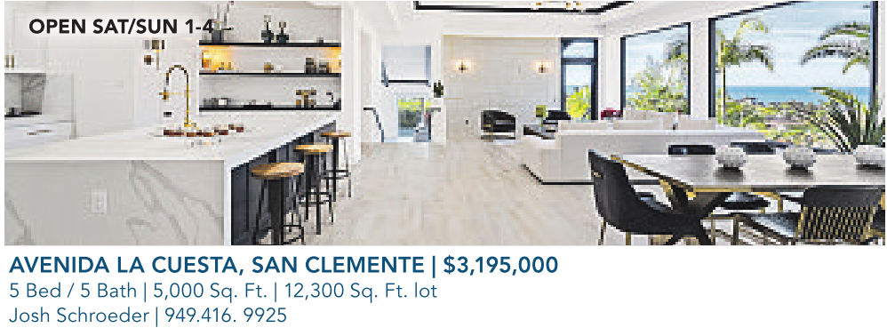 AVENIDA LA CUESTA, SAN CLEMENTE | $3,195,000 5 Bed / 5 Bath | 5,000 Sq. Ft. | 12,300 Sq. Ft. lot Josh Schroeder | 949.416. 9925