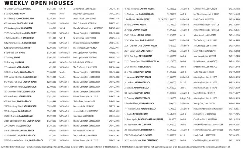 8Las Flores, ALISO VIEJO $599,900 Sun 1-4 StacyAllen, Lic #00909308 949.422.2072 54 Drakes BayDr, CORONADEL MAR $2,794,800 Sun 1-4 Susan Sinclair, Lic #01501430 949.697.4144 400 Iris Avenue, CORONA DEL MAR $1,950,000 Sat/Sun 1-4 Mark D. Simon, Lic #00816134 949.872.8322 651 Breakaway Lane, COSTAMESA $998,000 Sat 1-4 Marcella Seidensticker, Lic #01987107 949.307.0455 35455 Camino Capistrano, DANA POINT $3,295,000 Sat/Sun 1-4 Shauna Covington, Lic #00991380 949.412.8088 33671Blue Lantern .A,DANA POINT $925,000 Sat 1-4 Susan Sinclair, Lic #01501430 949.697.4144 9062 Marlene Avenue, GARDENGROVE $598,000 Sat/Sun 1-4 Debbie Derloshon, Lic #01483320 949.813.4355 6265 Sierra Sienna Road, IRVINE $2,398,000 Sat/Sun 1-4 Bita Tahmasebi, Lic #01976507 949.332.0864 6Dorchester East, IRVINE $1,198,880 Sat/Sun 12-4 Doris Lipscomb, Lic #00789985 714.585.7355 5Vicksburg, IRVINE $1,068,000 Sat/Sun 12-4 Doris Lipscomb, Lic #00789985 714.585.7355 21 Gramercy 209, IRVINE $649,900 Sat 1-4/Sun 12-3 Ralph Balo, Lic #00781143 949.322.1240 3Vinca Court, LADERARANCH $475,000 Sat/Sun 1-4 TheOra Group, Lic# 01210081 949.584.4466 1400 MarVista Way, LAGUNA BEACH $3,288,000 Sun 1-4 Shauna Covington, Lic #00991380 949.412.8088 1959 Temple Hills Drive, LAGUNA BEACH $3,195,000 Sun 1-4 Shauna Covington, Lic #00991380 949.412.8088 647Virginia Park Drive, LAGUNA BEACH $2,988,000 Sat/Sun 1-4 Shauna Covington, Lic #00991380 949.412.8088 1141 CoastView Drive, LAGUNA BEACH $2,799,000 Sat/Sun 1-4 Shauna Covington, Lic #00991380 949.412.8088 757 CoastView Drive, LAGUNA BEACH $2,749,000 Sat/Sun 1-4 Shauna Covington, Lic #00991380 949.412.8088 475 AsterStreet, LAGUNA BEACH $2,675,000 Sat/Sun 1-4 Kristine Torrance, Lic #01175513 949.637.1160 420 Bent Street, LAGUNA BEACH $1,999,999 Sat/Sun 1-4 Sheila Green, Lic #00836673 949.499.5900 31252 Monterey Drive, LAGUNA BEACH $1,820,000 Sat/Sun 1-4 Ken Hanzlik, Lic#01904189 949.338.1666 109Blue Lagoon, LAGUNA BEACH $1,675,000 Sat/Sun 1-4 Jennifer Halbert, Lic #01992762 949.441.3359 31793 5th Avenue, LAGUNA BEACH $1,399,999 Sat/Sun 1-4 Todd Davis, Lic #01969131 949.447.4444 31561 Table Rock Drive416, LAGUNA BEACH $1,250,000 Sat/Sun 1-4 Shauna Covington, Lic #00991380 949.412.8088 234Cliff Drive2,LAGUNA BEACH $1,195,000 Sat/Sun 1-4 Shauna Covington, Lic #00991380 949.412.8088 316182Nd Avenue, LAGUNA BEACH $999,000 Sat/Sun 1-4 Ken Hanzlik, Lic #01904189 949.338.1666 1220 RooseveltLane, LAGUNA BEACH $975,000 Sat/Sun 1-4 TracyLineback, Lic #01998326 949.874.3961 21703Ocean Vista Drive 101-A, LAGUNA BEACH $777,000 Sat/Sun 1-4 Kristine Torrance, Lic #01175513 949.637.1160