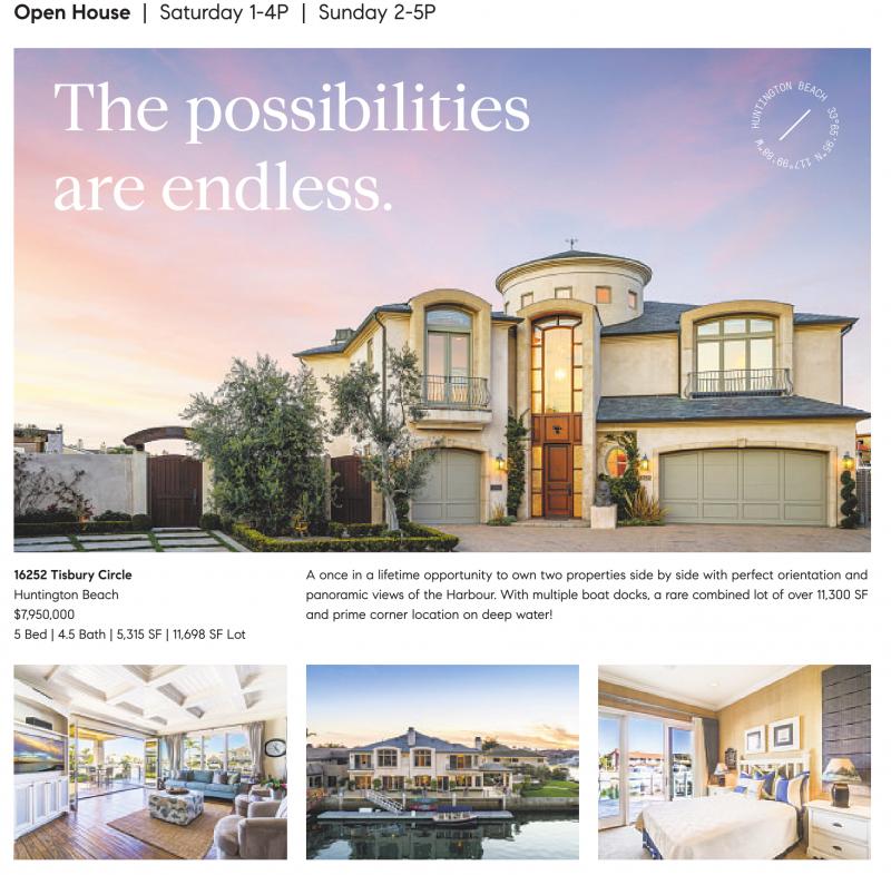 Open House | Saturday 1-4P | Sunday 2-5P The possibilities are endless. 16252 Tisbury Circle Huntington Beach $7,950,000 5 Bed | 4.5 Bath | 5,315 SF | 11,698 SF Lot A once in a lifetime opportunity to own two properties side by side with perfect orientation and panoramic views of the Harbour. With multiple boat docks, a rare combined lot of over 11,300 SF and prime corner location on deep water! See also