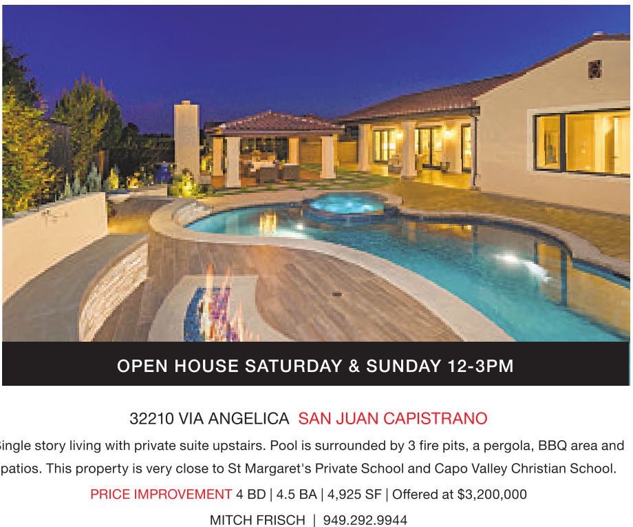 OPEN HOUSE SATURDAY & SUNDAY 12-3PM 32210 VIA ANGELICA SAN JUAN CAPISTRANO Single story living with private suite upstairs. Pool is surrounded by3fire pits, apergola, BBQ area and patios. This property is very close to St Margaret's Private School and Capo Valley Christian School. PRICE IMPROVEMENT 4BD|4.5 BA |4,925 SF |Offered at $3,200,000 MITCH FRISCH | 949.292.9944