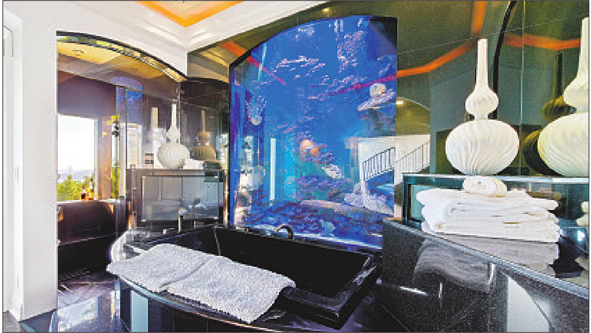 Walls of windows fill the master suite, and the sleek bathroom is anchored by a spa tub with a fish tank.
