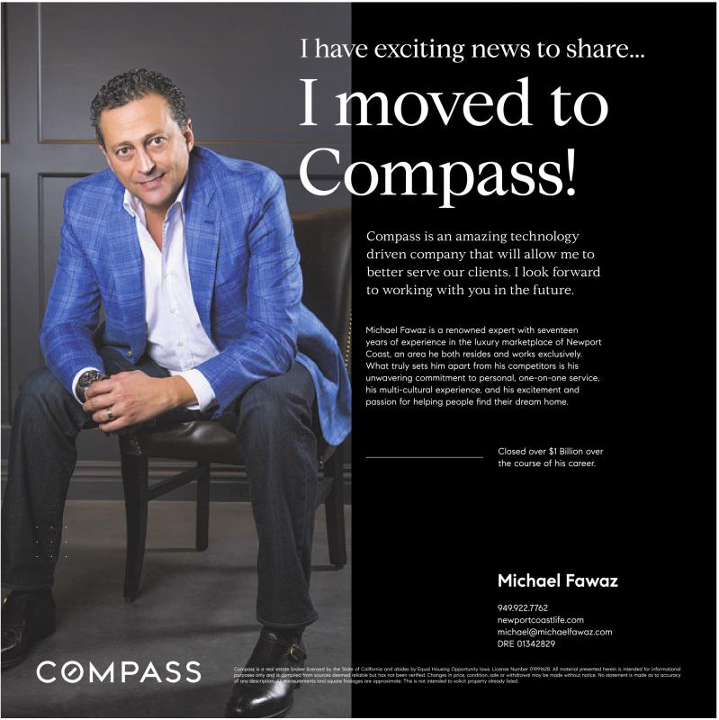 I have exciting news to share... I moved to Compass! Compass is an amazing technology driven company that will allow me to better serve our clients. I look forward to working with you in the future. Michael Fawaz is a renowned expert with seventeen years of experience in the luxury marketplace of Newport Coast, an area he both resides and works exclusively. What truly sets him apart from his competitors is his unwavering commitment to personal, one-on-one service, his multi-cultural experience, and his excitement and passion for helping people find their dream home. Closed over $1 Billion over the course of his career. Michael Fawaz 949.922.7762 newportcoastlife.com michael@michaelfawaz.com DRE 01342829 Compass is areal estate broker licensed by the State of California and abides byEqual Housing Opportunity laws. License Number 01991628. All material presented herein is intended for informational purposes only and iscompiled from sources deemed reliable but has not been verified. Changes inprice, condition, sale or withdrawal may be made without notice. No statement ismade as to accuracy of any description. All measurements and square footages are approximate. This is not intended tosolicit property already listed.
