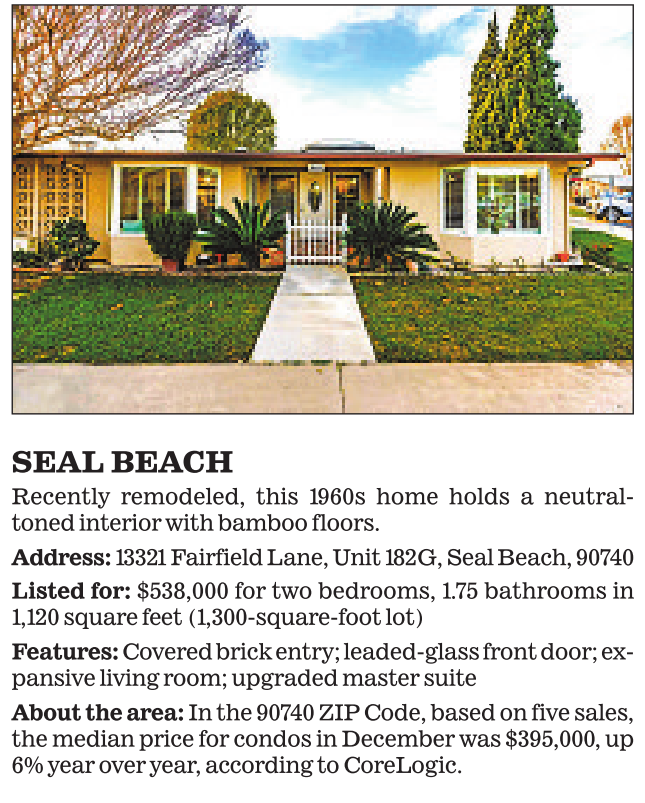 SEAL BEACH Recently remodeled, this 1960s home holds a neutraltoned interior with bamboo floors. Address:13321 Fairfield Lane, Unit182G, Seal Beach, 90740 Listed for: $538,000 for two bedrooms, 1.75 bathrooms in 1,120 square feet (1,300-square-foot lot) Features: Covered brick entry; leaded-glass front door; expansive living room; upgraded master suite About the area: In the 90740 ZIP Code, based on five sales, the median price for condos in December was $395,000, up 6% year over year, according to CoreLogic. See also