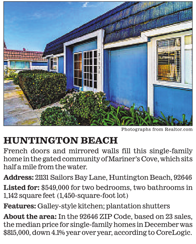 Photographs from Realtor.com HUNTINGTON BEACH French doors and mirrored walls fill this single-family home in the gated community of Mariner’s Cove, which sits half a mile from the water. Address: 21131 Sailors Bay Lane, Huntington Beach, 92646 Listed for: $549,000 for two bedrooms, two bathrooms in 1,142 square feet (1,450-square-foot lot) Features: Galley-style kitchen; plantation shutters About the area: In the 92646 ZIP Code, based on 23 sales, the median price for single-family homes in December was $815,000, down 4.1% year over year, according to CoreLogic.