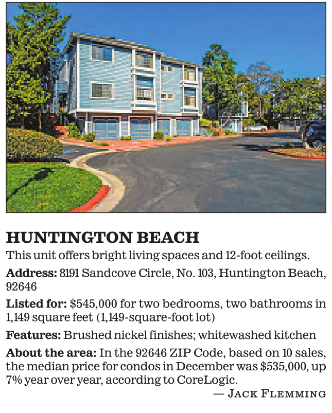 HUNTINGTON BEACH This unit offers bright living spaces and 12-foot ceilings. Address: 8191 Sandcove Circle, No. 103, Huntington Beach, 92646 Listed for: $545,000 for two bedrooms, two bathrooms in 1,149 square feet (1,149-square-foot lot) Features: Brushed nickel finishes; whitewashed kitchen About the area: In the 92646 ZIP Code, based on 10 sales, the median price for condos in December was $535,000, up 7% year over year, according to CoreLogic. — Jack Flemming