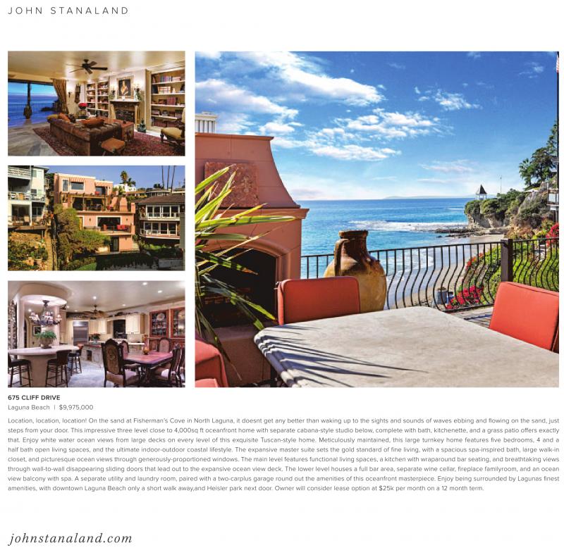 J O H N S T A N A L A N D 675 CLIFF DRIVE Laguna Beach | $9,975,000 Location, location, location! On the sand at Fisherman’s Cove in North Laguna, it doesnt get any better than waking up to the sights and sounds of waves ebbing and flowing on the sand, just steps from your door. This impressive three level close to 4,000sq ft oceanfront home with separate cabana-style studio below, complete with bath, kitchenette, and a grass patio offers exactly that. Enjoy white water ocean views from large decks on every level of this exquisite Tuscan-style home. Meticulously maintained, this large turnkey home features five bedrooms, 4 and a half bath open living spaces, and the ultimate indoor-outdoor coastal lifestyle. The expansive master suite sets the gold standard of fine living, with a spacious spa-inspired bath, large walk-in closet, and picturesque ocean views through generously-proportioned windows. The main level features functional living spaces, a kitchen with wraparound bar seating, and breathtaking views through wall-to-wall disappearing sliding doors that lead out to the expansive ocean view deck. The lower level houses a full bar area, separate wine cellar, fireplace familyroom, and an ocean view balcony with spa. A separate utility and laundry room, paired with a two-carplus garage round out the amenities of this oceanfront masterpiece. Enjoy being surrounded by Lagunas finest amenities, with downtown Laguna Beach only a short walk away,and Heisler park next door. Owner will consider lease option at $25k per month on a 12 month term. johnstanaland .com