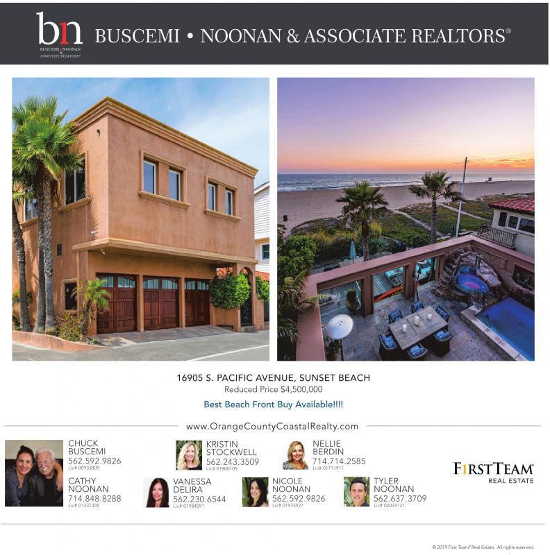 BUSCEMI NOONAN & ASSOCIATE REALTORS ® BUSCEMI • NOONAN & ASSOCIATE REALTORS ® CHUCK BUSCEMI 562.592.9826 Lic# 00933809 CATHY NOONAN 714.848.8288 Lic# 01237305 16905 S. PACIFIC AVENUE, SUNSET BEACH Reduced Price $4,500,000 Best Beach Front Buy Available!!!! . www.OrangeCountyCoastalRealty.com KRISTIN STOCKWELL 562.243.3509 Lic# 01900105 NELLIE BERDIN 714.714.2585 Lic# 01711911 VANESSA DELIRA 562.230.6544 Lic# 01984091 NICOLE NOONAN 562.592.9826 Lic# 01975927 TYLER NOONAN 562.637.3709 Lic# 02034721 ©2019 First Team ® Real Estate. All rights reserved.
