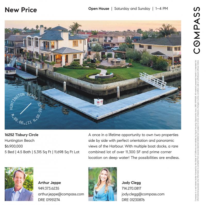 New Price Open House | Saturday and Sunday | 1–4 PM 16252 Tisbury Circle Huntington Beach $6,900,000 5 Bed | 4.5 Bath | 5,315 Sq Ft | 11,698 Sq Ft Lot Arthur Jeppe 949.373.6235 arthur.jeppe@compass.com DRE 01951274 A once in a lifetime opportunity to own two properties side by side with perfect orientation and panoramic views of the Harbour. With multiple boat docks, a rare combined lot of over 11,300 SF and prime corner location on deep water! The possibilities are endless. Jody Clegg 714.270.0817 jody.clegg@compass.com DRE 01230876