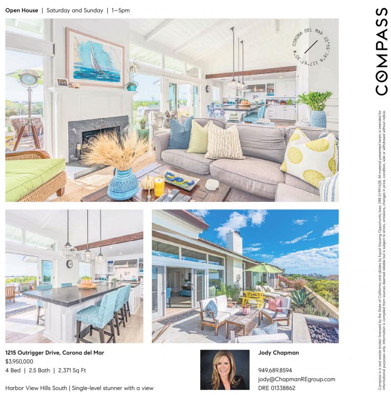 Open House | Saturday and Sunday | 1–5pm 1215 Outrigger Drive, Corona del Mar $3,950,000 4 Bed | 2.5 Bath | 2,371 Sq Ft Harbor View Hills South | Single-level stunner with a view Jody Chapman 949.689.8594 jody@ChapmanREgroup.com DRE 01338862 See also