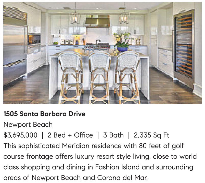 1505 Santa Barbara Drive Newport Beach This sophisticated Meridian residence with 80 feet of golf course frontage offers luxury resort style living, close to world class shopping and dining in Fashion Island and surrounding areas of Newport Beach and Corona del Mar.