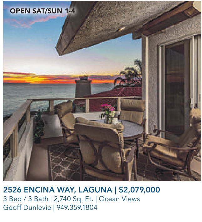 OPEN SAT/SUN 1-4 2526 ENCINA WAY, LAGUNA | $2,079,000 3 Bed / 3 Bath | 2,740 Sq. Ft. | Ocean Views Geoff Dunlevie | 949.359.1804 See also