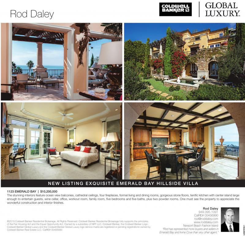 1123 EMERALD BAY | $10,200,000 The stunning interiors feature ocean view balconies, cathedral ceilings, four fireplaces, formal living and dining rooms, gorgeous stone floors, terrific kitchen with center island large enough to entertain guests, wine cellar, office, workout room, family room, five bedrooms and five baths, plus two powder rooms. One must see the property to appreciate the wonderful construction and interior finishes.