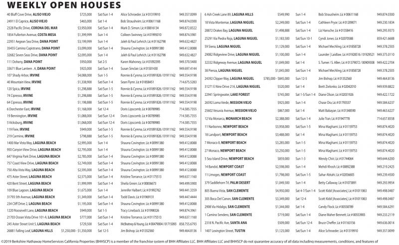 6Ash Creek Lane89, LAGUNA HILLS $549,990 Sun 1-4 Bob Strausheim, Lic #00611168 949.874.0300 18 VistaMontemar, LAGUNA NIGUEL $2,249,000 Sat/Sun1-4 Cathleen Pryor, Lic #01209071 949.230.1834 28872Drakes Bay, LAGUNA NIGUEL $1,498,888 Sat/Sun 1-4 Liz Hansche, Lic #01358416 949.295.9373 25291 ViaPiedra Roja, LAGUNA NIGUEL $1,183,500 Sat/Sun 10-1 Cyndi Jones, Lic #02070588 859.421.6688 59 Siena, LAGUNA NIGUEL $1,129,000 Sat/Sun 1-4 Michael Mechling, Lic#01858728 949.378.2505 29082Ridgeview Drive, LAGUNA NIGUEL $1,100,000 Sun1-4 Launder |Laidlaw, Lic #01928516 /01929521 949.375.0110 32332RidgewayAvenue, LAGUNA NIGUEL $1,049,000 Sat1-4 S. Turner /S.Allen, Lic #01379072 /00909308 949.422.2704 38 Pienza, LAGUNA NIGUEL $1,045,000 Sat/Sun1-4 Michael Mechling, Lic#01858728 949.378.2505 24392Clipper Way, LAGUNA NIGUEL $785,000 -$845,000 Sun 12-5 Jim Bishop, Lic #01352560 949.464.8136 31271 ENine Drive21A, LAGUNA NIGUEL $520,000 Sat 1-4 Brett Zielonko, Lic#02042010 949.939.8822 22941Springwater, LAKE FOREST $745,000 Sat 1-5/Sun 1-4 Diane Olson, Lic #02031926 949.422.1722 26592Loma Verde, MISSIONVIEJO $925,000 Sun 1-4 Chase Ora, Lic #01793537 949.584.6237 25602VesuviaAvenue, MISSIONVIEJO $867,000 Sat 1-4 Matt Babayan, Lic#01348590 949.463.6227 12 ViaMonarca, MONARCH BEACH $2,388,000 Sat/Sun 1-4 Julie Tran, Lic #01947778 714.657.8558 11 Narbonne, NEWPORT BEACH $3,958,000 Sat/Sun1-5 Mina Maghami, Lic #01159753 949.874.4020 18 Landport, NEWPORT BEACH $3,488,000 Sat1-4 Mina Maghami, Lic #01159753 949.874.4020 7Monaco8,NEWPORT BEACH $3,285,000 Sun1-5 Mina Maghami, Lic #01159753 949.874.4020 27 Monaco, NEWPORT BEACH $3,250,000 Sun1-5 Mina Maghami, Lic #01159753 949.874.4020 5Sea Island Drive, NEWPORT BEACH $859,000 Sun 1-3 Wendy Chiri, Lic #01744064 949.644.6200 14 Bandol, NEWPORT COAST $2,598,000 Sun1-4 Mehdi Khosh, Lic #00892388 949.219.2425 11 Limoges, NEWPORT COAST $1,798,000 Sat/Sun 1-5 Sahar Abtahi, Lic #02056605 949.239.4500 379 Saddlehorn Trl, PALM DESERT $1,049,500 Sun1-4 BettyCallaway, Lic #01073891 949.293.9954 805Buena Vista, SAN CLEMENTE $4,950,000 Sat 4-7/Sun1-4 ScottKidd |Associates|, Lic #01011063 949.498.0487 305 Boca DelCanon, SAN CLEMENTE $3,349,000 Sat 12-4 Scott Kidd |Associates|, Lic #01011063 949.498.0487 2908 ViaHidalgo, SAN CLEMENTE $1,344,000 Sat 1-4 Candy Flock, Lic #00558789 949.584.6291 1Camino Sendero, SAN CLEMENTE $719,000 Sat/Sun 1-4 Diane Maher Bennett, Lic #00553905 949.233.2119 2318 N. Pacific Ave, SANTAANA $509,000 Sat/Sun 12-4 BruceCheffer, Lic#01163156 949.636.0014 1407 Lexington Street, TUSTIN $1,125,000 Sat/Sun1-4 AliceSchroeder, Lic #01319910 949.357.0099