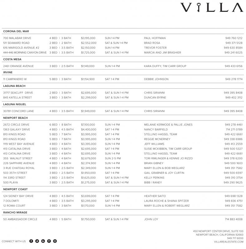 2672 CIRCLE DRIVE 6 BED | 8 BATH $7,100,000 SUN 1-4 PM MELANIE KERMODE & PALLIE JONES 949 278 4461 1363 GALAXY DRIVE 4 BED | 4.5 BATH $4,400,000 SAT 1-4 PM NANCY BARFIELD 714 271 0789 810 KINGS ROAD 5 BED | 7 BATH $3,995,000 SAT 1-4 PM STELLINO HASSEL TEAM 949 422 6661 810 KINGS ROAD 5 BED | 7 BATH $3,995,000 SUN 1-4 PM REGGIE MCNERNEY 949 338 6986 1119 WEST BAY AVENUE 4 BED | 4 BATH $3,395,000 SUN 1-4 PM JEFF WILLIAMS 949 413 2559 413 CATALINA DRIVE 3 BED | 4 BATH $2,695,000 SAT 1-4 PM SUSIE MCKIBBEN, TIM CARR GROUP 949 500 5327 413 CATALINA DRIVE 3 BED | 4 BATH $2,695,000 SUN 1-4 PM STELLINO HASSEL TEAM 949 422 6661 355 WALNUT STREET 4 BED | 4 BATH $2,679,000 SUN 2-5 PM TORI RIMLINGER & KENNIE JO RIZZO 949 378 6200 226 SAPPHIRE AVENUE 4 BED | 4 BATH $2,374,900 SUN 1-4 PM BRIAN GIBNEY 949 500 1603 3 RUE CHATEAU ROYAL 3 BED | 2.5 BATH $2,349,000 SUN 1-4 PM MARY ELLEN & BOB WEGLARZ 949 351 7582 503 35TH STREET 3 BED | 2.5 BATH $1,950,000 SAT 1-4 PM GAIL GRABNER & JOY CURTIN 949 500 6597 114 33RD STREET 3 BED | 2.5 BATH $1,625,000 SAT & SUN 1-4 PM KELLY PERKINS 949 310 3754 500 PLAYA 3 BED | 2.5 BATH $1,275,000 SAT & SUN 1-4 PM BIBB | RANEY 949 290 9625