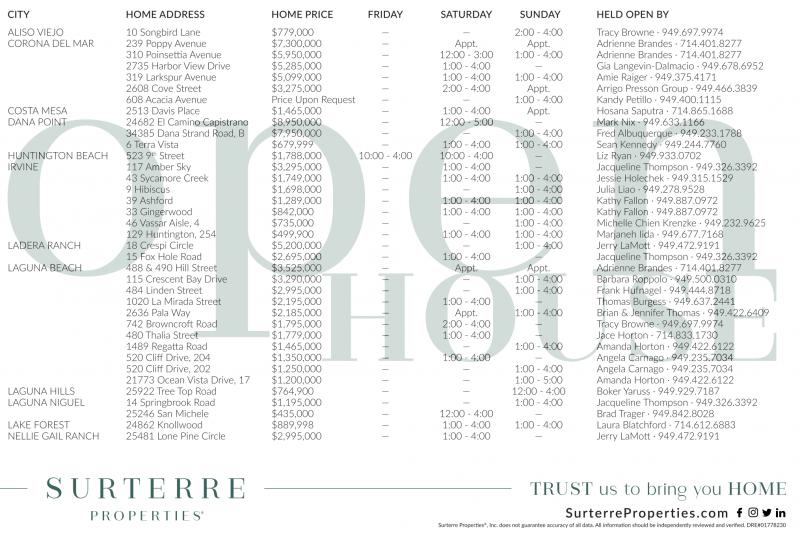 ALISO VIEJO 10 Songbird Lane $779,000 — — 2:00 - 4:00 Tracy Browne · 949.697.9974 CORONA DEL MAR 239 PoppyAvenue $7,300,000 — Appt. Appt. Adrienne Brandes · 714.401.8277 2735 Harbor View Drive $5,285,000 — 1:00 - 4:00 — Gia Langevin-Dalmacio · 949.678.6952 319 Larkspur Avenue $5,099,000 — 1:00 - 4:00 1:00 - 4:00 Amie Raiger · 949.375.4171 2608 Cove Street $3,275,000 — 2:00 - 4:00 Appt. Arrigo Presson Group · 949.466.3839 COSTA MESA 2513 Davis Place $1,465,000 — 1:00 - 4:00 Appt. Hosana Saputra · 714.865.1688 DANA POINT 24682 El Camino Capistrano $8,950,000 — 12:00 - 5:00 — Mark Nix · 949.633.1166 34385 Dana Strand Road, B $7,950,000 — — 1:00 - 4:00 Fred Albuquerque · 949.233.1788 6 Terra Vista $679,999 — 1:00 - 4:00 1:00 - 4:00 Sean Kennedy · 949.244.7760 HUNTINGTON BEACH 523 9 t h Street $1,788,000 10:00 - 4:00 10:00 - 4:00 — Liz Ryan · 949.933.0702 IRVINE 117 Amber Sky $3,295,000 — 1:00 - 4:00 — Jacqueline Thompson · 949.326.3392 43 Sycamore Creek $1,749,000 — 1:00 - 4:00 1:00 - 4:00 Jessie Holechek · 949.315.1529 9 Hibiscus $1,698,000 — — 1:00 - 4:00 Julia Liao · 949.278.9528 39 Ashford $1,289,000 — 1:00 - 4:00 1:00 - 4:00 Kathy Fallon · 949.887.0972 33 Gingerwood $842,000 — 1:00 - 4:00 1:00 - 4:00 Kathy Fallon · 949.887.0972 46 VassarAisle, 4 $735,000 — — 1:00 - 4:00 Michelle Chien Krenzke · 949.232.9625 LADERA RANCH 15 Fox Hole Road $2,695,000 — 1:00 - 4:00 — Jacqueline Thompson · 949.326.3392 LAGUNA BEACH 488 & 490 Hill Street $3,525,000 — Appt. Appt. Adrienne Brandes · 714.401.8277 115 Crescent Bay Drive $3,290,000 — — 1:00 - 4:00 Barbara Roppolo · 949.500.0310 484 Linden Street $2,995,000 — — 1:00 - 4:00 Frank Hufnagel · 949.444.8718 1020 La Mirada Street $2,195,000 — 1:00 - 4:00 — Thomas Burgess · 949.637.2441 2636 Pala Way $2,185,000 — Appt. 1:00 - 4:00 Brian & Jennifer Thomas · 949.422.6409 480 Thalia Street $1,779,000 — 1:00 - 4:00 — Jace Horton · 714.833.1730 21773 Ocean Vista Drive, 17 $1,200,000 — — 1:00 - 5:00 Amanda Horton · 949.422.6122 LAGUNA HILLS 25922 Tree Top Road $764,900 — — 12:00 - 4:00 BokerYaruss · 949.929.7187 LAGUNA NIGUEL 14 Springbrook Road $1,195,000 — — 1:00 - 4:00 Jacqueline Thompson · 949.326.3392 25246 San Michele $435,000 — 12:00 - 4:00 — Brad Trager · 949.842.8028 LAKE FOREST 24862 Knollwood $889,998 — 1:00 - 4:00 1:00 - 4:00 Laura Blatchford · 714.612.6883 NELLIE GAIL RANCH SurterreProperties.com