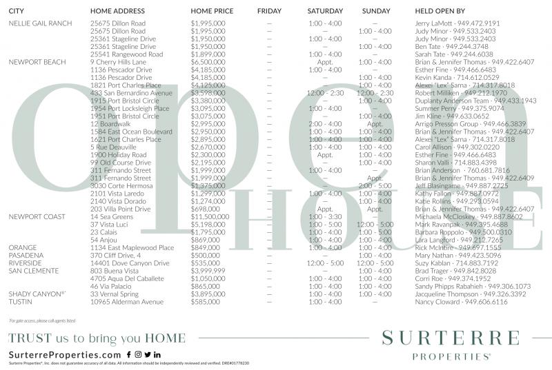 NELLIE GAIL RANCH 25675 Dillon Road $1,995,000 — 1:00 - 4:00 — Jerry LaMott · 949.472.9191 25675 Dillon Road $1,995,000 — — 1:00 - 4:00 Judy Minor · 949.533.2403 25361 Stageline Drive $1,950,000 — 1:00 - 4:00 — Judy Minor · 949.533.2403 25361 Stageline Drive $1,950,000 — — 1:00 - 4:00 Ben Tate · 949.244.3748 25541 Rangewood Road $1,899,000 — 1:00 - 4:00 — Sarah Tate · 949.244.6038 NEWPORT BEACH 9 Cherry Hills Lane $6,500,000 — Appt. 1:00 - 4:00 Brian & Jennifer Thomas · 949.422.6407 1136 Pescador Drive $4,185,000 — 1:00 - 4:00 — Esther Fine · 949.466.6483 1136 Pescador Drive $4,185,000 — — 1:00 - 4:00 Kevin Kanda · 714.612.0529 1821 Port Charles Place $4,125,000 — — 1:00 - 4:00 Alexei “Lex” Sarna · 714.317.8018 433 San Bernardino Avenue $3,598,000 — 12:00 - 2:30 12:00 - 2:30 Robert Milliken · 949.212.1970 1915 Port Bristol Circle $3,380,000 — — 1:00 - 4:00 Duplanty Anderson Team · 949.433.1943 1954 Port Locksleigh Place $3,095,000 — 1:00 - 4:00 — Summer Perry · 949.375.9074 1951 Port Bristol Circle $3,075,000 — — 1:00 - 4:00 Jim Kline · 949.633.0652 12 Boardwalk $2,995,000 — 2:00 - 4:00 Appt. Arrigo Presson Group · 949.466.3839 1584 East Ocean Boulevard $2,950,000 — 1:00 - 4:00 1:00 - 4:00 Brian & Jennifer Thomas · 949.422.6407 1621 Port Charles Place $2,895,000 — 1:00 - 4:00 1:00 - 4:00 Alexei “Lex” Sarna · 714.317.8018 5 Rue Deauville $2,670,000 — 1:00 - 4:00 1:00 - 4:00 Carol Allison · 949.302.0220 1900 Holiday Road $2,300,000 — Appt. 1:00 - 4:00 Esther Fine · 949.466.6483 99 Old Course Drive $2,195,000 — — 1:00 - 4:00 Sharon Valli · 714.883.4398 311 Fernando Street $1,999,000 — 1:00 - 4:00 — Brian Anderson · 760.681.7816 311 Fernando Street $1,999,000 — — Appt. Brian & Jennifer Thomas · 949.422.6409 3030 Corte Hermosa $1,375,000 — — 2:00 - 5:00 Jeff Blasingame · 949.887.2725 2101 Vista Laredo $1,299,000 — 1:00 - 4:00 1:00 - 4:00 Kathy Fallon · 949.887.0972 2140 Vista Dorado $1,274,000 — — 1:00 - 4:00 Katie Rollins · 949.293.0594 203 Villa Point Drive $698,000 — Appt. Appt. Brian & Jennifer Thomas · 949.422.6407 NEWPORT COAST 14 Sea Greens $11,500,000 — 1:00 - 3:30 — Michaela McCloskey · 949.887.8602 37 Vista Luci $5,198,000 — 1:00 - 5:00 12:00 - 5:00 Mark Ravanpak · 949.395.4688 23 Calais $1,795,000 — 1:00 - 4:00 1:00 - 5:00 Barbara Roppolo · 949.500.0310 54 Anjou $869,000 — 1:00 - 4:00 1:00 - 4:00 Lara Langford · 949.212.7265 ORANGE 1134 East Maplewood Place $849,000 — 1:00 - 4:00 1:00 - 4:00 Rick McIntire · 949.697.1555 PASADENA 370 Cliff Drive, 4 $500,000 — — 1:00 - 4:00 Mary Nathan · 949.423.5096 RIVERSIDE 14401 Dove Canyon Drive $535,000 — 12:00 - 5:00 12:00 - 5:00 Suzy Kablan · 714.883.7192 SAN CLEMENTE 803 Buena Vista $3,999,999 — — 1:00 - 4:00 Brad Trager · 949.842.8028 4705 Aqua Del Caballete $1,050,000 — 1:00 - 4:00 1:00 - 4:00 Corri Roe · 949.374.1952 46 Via Palacio $865,000 — 1:00 - 4:00 1:00 - 4:00 Sandy Phipps Rabahieh · 949.306.1073 SHADY CANYON ®* 33 Vernal Spring $3,895,000 — 1:00 - 4:00 1:00 - 4:00 Jacqueline Thompson · 949.326.3392 TUSTIN 10965 Alderman Avenue $585,000 — 1:00 - 4:00 — Nancy Cloward · 949.606.6116