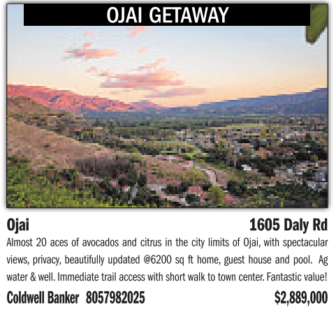 Almost 20aces ofavocados and citrus in the city limits of Ojai, with spectacular views, privacy,beautifully updated @6200 sq ft home,guest house and pool. Ag water &well. Immediate trail access with shortwalktotowncenter.Fantasticvalue!
