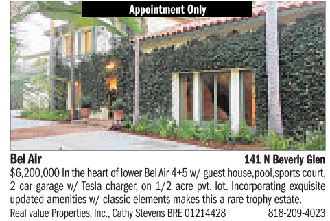 Bel Air 141NBeverly Glen $6,200,000 In the heartoflower BelAir 4+5 w/ guest house,pool,sports court, 2car garage w/ Tesla charger,on1/2 acre pvt. lot. Incorporating exquisite updated amenities w/ classic elements makes this arare trophy estate. Real value Properties, Inc., CathyStevens BRE 01214428 818-209-4023