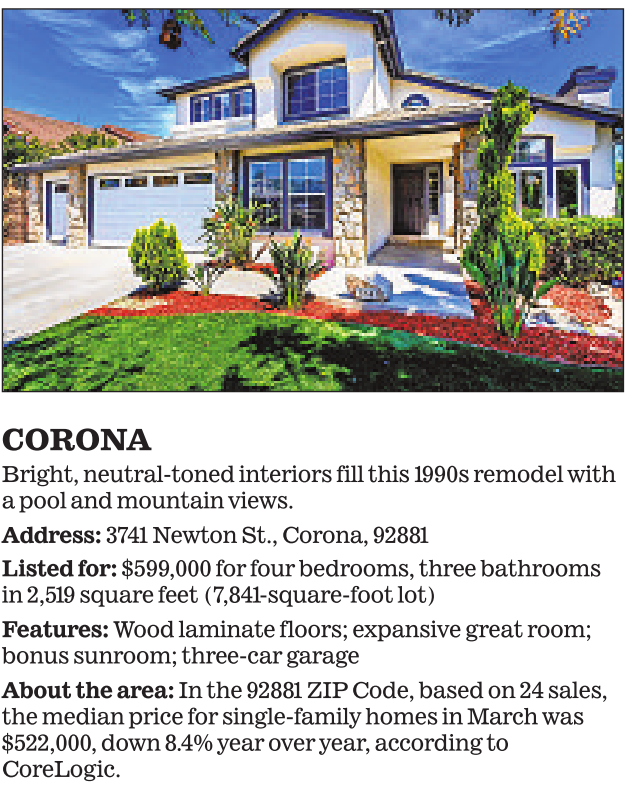 CORONA Bright, neutral-toned interiors fill this 1990s remodel with apool and mountain views. Address: 3741 Newton St., Corona, 92881 Listed for: $599,000 for four bedrooms, three bathrooms in 2,519 square feet (7,841-square-foot lot) Features: Wood laminate floors; expansive great room; bonus sunroom; three-car garage About the area: In the 92881 ZIP Code, based on 24 sales, the median price for single-family homes in March was $522,000, down 8.4% year over year, according to CoreLogic. See also