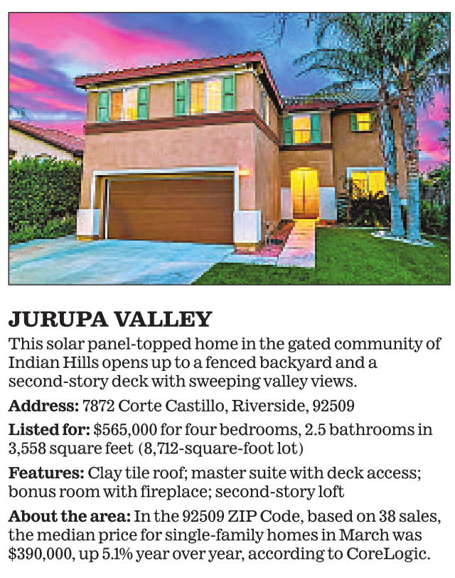 JURUPA VALLEY This solar panel-topped home in the gated community of Indian Hills opens up to a fenced backyard and a second-story deck with sweeping valley views. Address: 7872 Corte Castillo, Riverside, 92509 Listed for: $565,000 for four bedrooms, 2.5 bathrooms in 3,558 square feet (8,712-square-foot lot) Features: Clay tile roof; master suite with deck access; bonus room with fireplace; second-story loft About the area: In the 92509 ZIP Code, based on 38 sales, the median price for single-family homes in March was $390,000, up 5.1% year over year, according to CoreLogic. See also