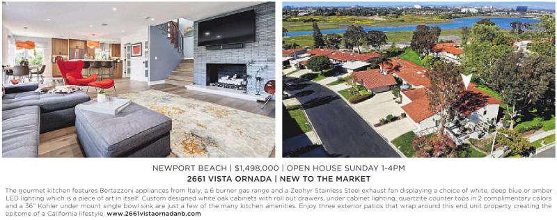 NEWPORT BEACH | $1,498,000 | OPEN HOUSE SUNDAY 1-4PM 2661 VISTA ORNADA | NEW TO THE MARKET The gourmet kitchen features Bertazzoni appliances from Italy, a 6 burner gas range and a Zephyr Stainless Steel exhaust fan displaying a choice of white, deep blue or amber LED lighting which is a piece of art in itself. Custom designed white oak cabinets with roll out drawers, under cabinet lighting, quartzite counter tops in 2 complimentary colors and a 36” Kohler under mount single bowl sink are just a few of the many kitchen amenities. Enjoy three exterior patios that wrap around this end unit property creating the epitome of a California lifestyle. www.2661vistaornadanb.com