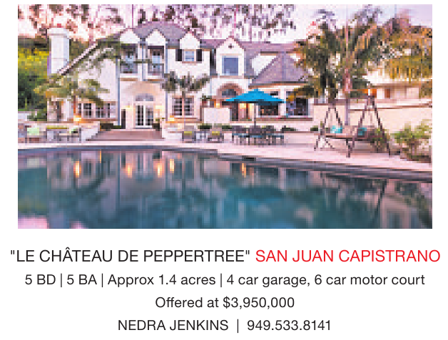 "LE CHÂTEAU DE PEPPERTREE" SAN JUAN CAPISTRANO 5BD|5BA|Approx 1.4 acres |4car garage, 6car motor court Offered at $3,950,000 NEDRA JENKINS | 949.533.8141