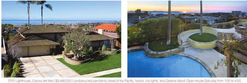 2707 Lighthouse, Corona del Mar | $3,495,000 | Unobstructed panoramic views of the Pacific, harbor, city lights, and Catalina Island. Open House Saturday from 1:00 to 4:00.