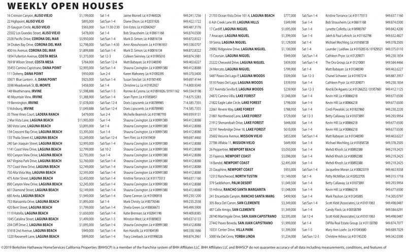 16 Crimson Canyon, ALISO VIEJO $1,199,000 Sat 1-4 Jaime Morrell, Lic#01469226 949.241.1256 22 Highpoint, ALISO VIEJO $895,000 Sat/Sun 1-4 Diane Olson, Lic #02031926 949.422.1722 25 Gauguin Circle, ALISO VIEJO $565,000 Sun 11:30-2:30 Erin Estes, Lic #02042427 949.487.3176 23502Los Grandes Street, ALISO VIEJO $478,000 Sat 1-4 Bob Strausheim, Lic #00611168 949.874.0300 2328 Pacific Drive, CORONA DEL MAR $3,950,000 Sat/Sun 1-4 Mark D. Simon, Lic #00816134 949.872.8322 34 Drakes BayDrive, CORONA DEL MAR $2,798,000 Sat/Sun 1-4:30 Amir Abouhossein, Lic#01961651 949.338.0707 400 Iris Avenue, CORONA DEL MAR $1,899,888 Sat/Sun 1-4 Mark D. Simon, Lic #00816134 949.872.8322 1854 FullertonAvenue, COSTAMESA $1,375,000 Sat 12-3 Colleen Swinney, Lic #01995010 949.874.5981 769 WWilson Street, COSTAMESA $764,000 Sat/Sun 12-4 Matt Babayan, Lic #01348590 949.463.6227 35455 Camino Capistrano, DANA POINT $2,995,000 Sat/Sun 1-4 Shauna Covington, Lic #00991380 949.412.8088 111Doheny, DANA POINT $950,000 Sun 2-4 KarenMahoney, Lic #01092395 949.370.5400 33671 Blue Lantern .A,DANA POINT $925,000 Sat/Sun 1-4 Susan Sinclair, Lic #01501430 949.697.4144 3598 Meadowlark St, EL MONTE $458,000 Sat 1-4 Christine Lu, Lic #01952927 714.800.9340 148Weathervane, IRVINE $1,598,888 Sat/Sun 1-5 Ronnie &Cyrena, Lic #01891826 /01911162 949.554.9198 40 Mountain View, IRVINE $1,388,900 Sat/Sun 1-4 Sean Flynn, Lic #01858451 714.675.5283 19 Bennington, IRVINE $1,078,000 Sat/Sun 12-4 Doris Lipscomb, Lic #00789985 714.585.7355 5Vicksburg, IRVINE $1,049,888 Sat/Sun 12-4 Doris Lipscomb, Lic #00789985 714.585.7355 35 ThreeVinesCourt, LADERARANCH $479,000 Sun 2-4 Michelle Beamish, Lic #01987793 949.939.9131 2Mar Vista Lane, LAGUNA BEACH $11,995,000 Sun 1-4 Shauna Covington, Lic #00991380 949.412.8088 580Vista Lane, LAGUNA BEACH $3,895,000 Sat 1-4 Shauna Covington, Lic #00991380 949.412.8088 134 Crescent BayDrive, LAGUNA BEACH $3,395,000 Sun 1-4 Shauna Covington, Lic #00991380 949.412.8088 155Thalia Street #2, LAGUNA BEACH $3,249,000 Sat/Sun 12-4 Terri Flint, Lic #01419439 949.697.4460 240San Joaquin Street, LAGUNA BEACH $2,995,000 Sat/Sun 1-4 Shauna Covington, Lic #00991380 949.412.8088 1141 Coast View Drive, LAGUNA BEACH $2,799,000 Sat 10-2 Shauna Covington, Lic #00991380 949.412.8088 950 Canyon View Drive, LAGUNA BEACH $2,795,000 Sun 1-4 Shauna Covington, Lic #00991380 949.412.8088 647VirginiaParkDrive, LAGUNA BEACH $2,760,000 Sat/Sun 1-4 Shauna Covington, Lic #00991380 949.412.8088 757 Coast View Drive, LAGUNA BEACH $2,749,000 Sat/Sun 1-4 Shauna Covington, Lic #00991380 949.412.8088 750 Alta Vista Way, LAGUNA BEACH $2,595,000 Sat/Sun 1-4 Shauna Covington, Lic #00991380 949.412.8088 475 AsterStreet, LAGUNA BEACH $2,450,000 Sat/Sun 1-4 Kristine Torrance, Lic #01175513 949.637.1160 890 Canyon View Drive, LAGUNA BEACH $2,245,000 Sat/Sun 1-4 Shauna Covington, Lic #00991380 949.412.8088 601 DiamondStreet, LAGUNA BEACH $2,149,000 Sat/Sun 1-4 Shauna Covington, Lic #00991380 949.412.8088 680 Anita, LAGUNA BEACH $1,949,000 Sat/Sun 1-4 Diane Cannon, Lic #01090918 949.230.1200 753 Manzanita Drive, LAGUNA BEACH $1,895,000 Sat 1-4 Mark Christy, Lic #00776546 949.235.2538 420 Bent Street, LAGUNA BEACH $1,799,000 Sat/Sun 1-4 Sheila Green, Lic #00836673 949.499.5900 1110 Katella, LAGUNA BEACH $1,650,000 Sat/Sun 1-4 KatieBrennan, Lic #02041196 949.400.8385 1045 Catalina Street, LAGUNA BEACH $1,499,000 Sat/Sun 1-5 Winston West, Lic #01809833 949.637.6133 234 Cliff Drive2,LAGUNA BEACH $1,095,000 Sat/Sun 1-4 Shauna Covington, Lic #00991380 949.412.8088 31618 2nd Avenue, LAGUNA BEACH $949,000 Sat/Sun 1-4 Ken Hanzlik, Lic #01904189 949.338.1666 1220 Roosevelt Lane, LAGUNA BEACH $899,000 Sat/Sun 1-4 TracyLineback, Lic #01998326 949.874.3961
