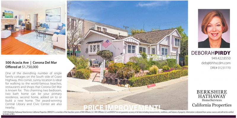 500 Acacia Ave | Corona Del Mar Offered at $1,750,000 One of the dwindling number of single family cottages on the South side of Coast Highway, this corner, sunny location is ideal for walking to the world-famous beaches, restaurants and shops that Corona Del Mar is known for. This charming two bedroom, two bath home can be your primary residence, second home, added on to or build a new home. The award-winning Central Library and Civic Center are also nearby. PRICE IMPROVEMENT! DEBORAHPIRDY 949.422.8550 deb@bhhscdm.com DRE# 01231770 ©2019 Berkshire Hathaway HomeServices California Properties (BHHSCP) is a member of the franchise system of BHH Affiliates LLC. BHH Affiliates LLC and BHHSCP do not guarantee accuracy of all data including measurements, conditions, and features of property. Information is obtained from various sources and will not be verified by broker or MLS.