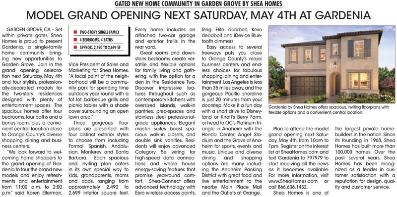 GARDEN GROVE, CA – Set within private gates, Shea Homes is proud to present Gardenia, a single-family home community bringing new opportunities to Garden Grove. Join in the grand opening celebration next Saturday, May 4th and tour stylish, professionally-decorated models for the two-story residences designed with plenty of entertainment spaces. The spacious homes offer four bedrooms,four baths and a bonus room, plus a convenient central location close to Orange County’s diverse shopping, dining and business centers.