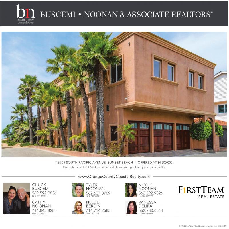 BUSCEMI NOONAN & ASSOCIATE REALTORS ® BUSCEMI • NOONAN & ASSOCIATE REALTORS ® 16905 SOUTH PACIFIC AVENUE, SUNSET BEACH | OFFERED AT $4,500,000 Exquisite beachfront Mediterranean-style home with pool and jacuzzi/spa grotto. www.OrangeCountyCoastalRealty.com CHUCK BUSCEMI 562.592.9826 Lic# 00933809 TYLER NOONAN 562.637.3709 Lic# 02034721 NICOLE NOONAN 562.592.9826 Lic# 01975927 CATHY NOONAN 714.848.8288 Lic# 01237305 NELLIE BERDIN 714.714.2585 Lic# 01711911 VANESSA DELIRA 562.230.6544 Lic# 01984091 ©2019 First Team ® Real Estate. All rights reserved. See also