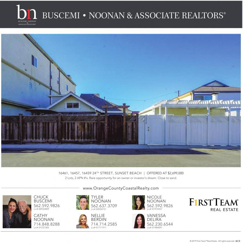 BUSCEMI NOONAN & ASSOCIATE REALTORS ® BUSCEMI • NOONAN & ASSOCIATE REALTORS ® 16461, 16457, 16459 24 TH STREET, SUNSET BEACH | OFFERED AT $2,699,000 2 Lots, 2 APN #’s. Rare opportunity for an owner or investor’s dream. Close to sand. www.OrangeCountyCoastalRealty.com CHUCK BUSCEMI 562.592.9826 Lic# 00933809 TYLER NOONAN 562.637.3709 Lic# 02034721 NICOLE NOONAN 562.592.9826 Lic# 01975927 CATHY NOONAN 714.848.8288 Lic# 01237305 NELLIE BERDIN 714.714.2585 Lic# 01711911 VANESSA DELIRA 562.230.6544 Lic# 01984091 ©2019 First Team ® Real Estate. All rights reserved. See also