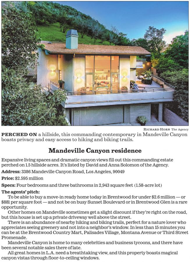 PERCHED ON a hillside, this commanding contemporary in Mandeville Canyon boasts privacy and easy access to hiking and biking trails.