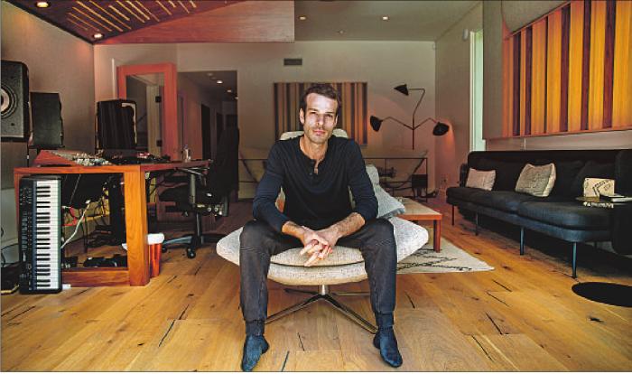 After years working in lifeless “cave dungeon” studios with no windows or sunlight (he ended up with a vitamin D deficiency), Lambroza decided to renovate the master bedroom of his 3,583- square-foot Encino home into a bright and breezy recording studio, with sliding doors leading to a lush backyard.