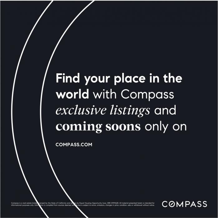 Find your place in the world with Compass exclusive listings and coming soons only on COMPASS.COM Compass is a real estate broker licensed by the State of California and abides by Equal Housing Opportunity laws. DRE 01991628. All material presented herein is intended for informational purposes only. Information is compiled from sources deemed reliable but is subject toerrors, omissions, changes inprice, condition, sale or withdrawal without notice.